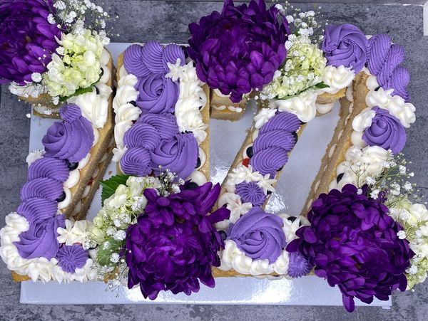 Our Letter / Number Cakes is one of our most popular cake creation's! It's the perfect dessert for any event! It's topped with fresh fruit, strawberries and blueberries. Along with colored pipped, buttercream designs and real or fake floral!